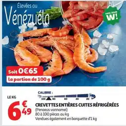 | Crevettes entières cuites réfrigérées (penaeus vannamei) | Auchan | 6,99 € | 29 octobre 2024 | 04 novembre 2024 | |||
