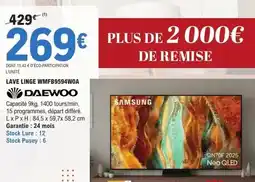 | Daewoo - lave linge wmfb9594woa | E.Leclerc | 429,00 € | 269,00 € | 160,00 € Réduction | 07 janvier 2026 | 03 février 2026 | |