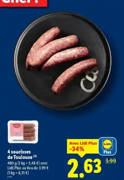 | 4 | 4 saucisses de Toulouse 480 g | Lidl | 3,99 € | 2,63 € | -34% | 12 février 2026 | 18 février 2026 | Voir l'offre | |