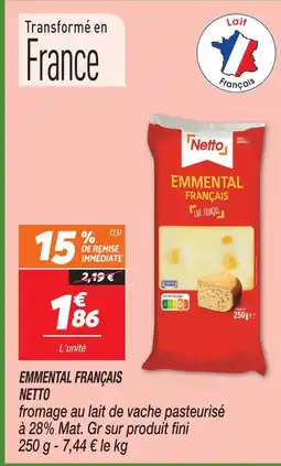 | 1 | NETTO Emmental français 250 g | Netto | 2,19 € | 1,86 € | 0,33 € Réduction | 17 mars 2026 | 23 mars 2026 | Voir l'offre | |