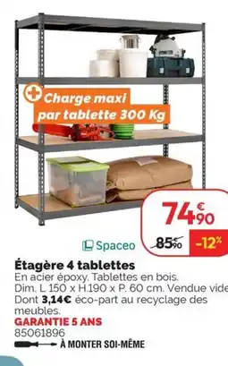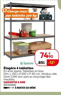 | Spaceo Étagère 4 tablettes | Weldom | 74,90 € | 01 avril 2025 | 06 mai 2025 | |||