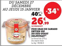 | DELPEYRAT Foie gras de canard entier igp du sud quest 270 g | Bi1 | 40,90 € | 26,99 € | -34% | 27 décembre 2025 | 04 janvier 2026 | |