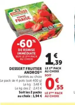 | ANDROS Dessert fruitier sans sucres ajoutes 650 g | Hyper U | 1,97 € | 0,63 € | 1,34 € Réduction | 27 janvier 2026 | 08 février 2026 | |