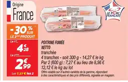 | Netto poitrine fumée tranchée | Netto | 4,28 € | 2,99 € | 1,29 € Réduction | 17 février 2026 | 23 février 2026 | |