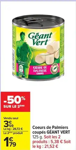 Carrefour Géant vert coeurs de palmiers coupés offreGéant vert coeurs de palmiers coupésCarrefour3,59 €Le 2ème à -50%06 janvier 202619 janvier 2026