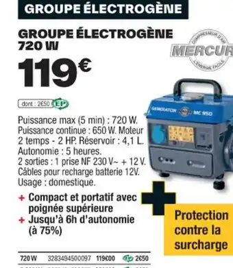 | MERCURE Groupe electrogene thermique 212cm3 systeme avr | Brico Dépôt | 189,00 € | 06 juin 2025 | 19 juin 2025 | |||