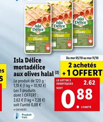 | Isla Délice Mortadélice Aux Olives Halal | Lidl | 0,88 € | 05 octobre 2022 | 11 octobre 2022 | |||
