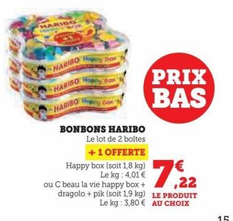 | BONBONS HARIBO | Hyper U | 11,92 € | 3,97 € | 7,95 € Réduction | 16 juillet 2024 | 28 juillet 2024 | |