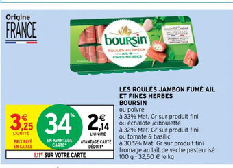 | BOURSIN Les roulés jambon fumé ail et fines herbes 100 g | Intermarché Hyper | 3,31 € | 1,32 € | -60% de remise | 07 octobre 2025 | 19 octobre 2025 | |