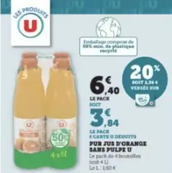 | PUR JUS D'ORANGE SANS PULPE U | Super U | 6,40 € | 3,84 € | 2,56 € Réduction | 30 avril 2024 | 12 mai 2024 | |