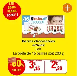 | Barres chocolatées kinder 200 g | Coccinelle Express | 3,15 € | 2,20 € | -60% SUR LE 2EME | 14 janvier 2026 | 25 janvier 2026 | |