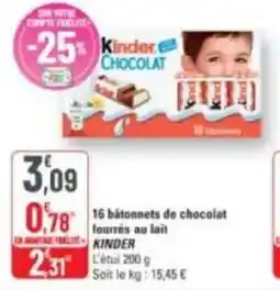 | 16 batonnets de chocolat fourrés au lait kinder 200 g | G20 | 3,09 € | 2,31 € | -25% | 14 janvier 2026 | 25 janvier 2026 | |