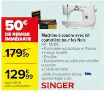 | Machine à coudre avec kit couturière pour les Nuls AMC: M2105 | Carrefour | 179,99 € | 129,99 € | 50,00 € Réduction | 08 janvier 2024 | 22 janvier 2024 | |