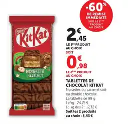 | MINI BARRE CHOCOLATEES KIT KAT | Super U | 3,29 € | 1,64 € | 1,65 € Réduction | 23 janvier 2024 | 04 février 2024 | |