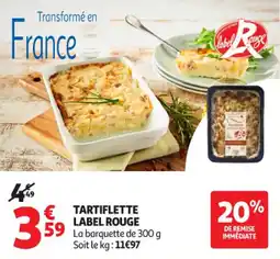 | 1 | Tartiflette label rouge 300 g | Auchan Supermarché | 4,49 € | 3,59 € | -20% | 20 janvier 2026 | 24 janvier 2026 | Voir l'offre | |