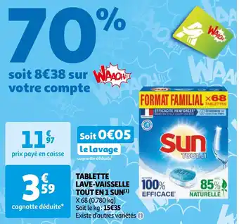 | TABLETTE LAVE-VAISSELLE TOUT EN 1 SUN(¹) | Auchan | 11,97 € | 3,59 € | 8,38 € Réduction | 06 février 2024 | 12 février 2024 | |