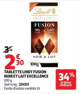 | Tablette lindt fusion noir et lait excellence 100 g | Auchan | 3,49 € | 2,30 € | 1,19 € Réduction | 03 février 2026 | 15 février 2026 | |