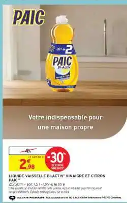 | PAIC Liquide vaisselle bi activ' vinaigre et citron 1,5 l | Intermarché | 4,27 € | 2,98 € | -30% De Remise | 30 décembre 2025 | 11 janvier 2026 | |