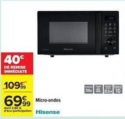 | 2 | ![]() | HISENSE Micro-ondes | Carrefour | 109,99 € | 69,99 € | 40,00 € Réduction | 17 mars 2026 | 30 mars 2026 | Voir l'offre |