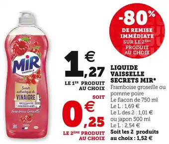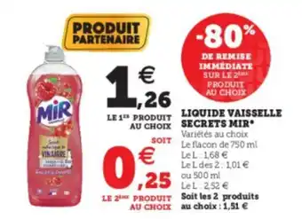 | Liquide Vaisselle Secrets Mir* | Super U | 1,26 € | 0,25 € | 1,01 € Réduction | 01 mars 2022 | 12 mars 2022 | |