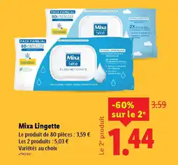 | 1 | MIXA Lingette | Lidl | 3,59 € | 1,44 € | 2,15 € Réduction | 12 février 2026 | 18 février 2026 | Voir l'offre | |