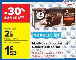 | 2 | Moelleux au chocolat noir carrefour extra 2x90 g | Carrefour Market | 2,19 € | 1,53 € | 0,66 € Réduction | 10 février 2026 | 22 février 2026 | Voir l'offre | |