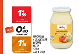 | MAYONNAISE À LA MOUTARDE DE DIJON NETTO | Netto | 1,59 € | 1,39 € | 0,20 € Réduction | 03 mai 2023 | 08 mai 2023 | |