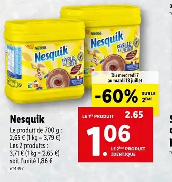 | Nesquik | Lidl | 2,65 € | 1,06 € | 1,59 € Réduction | 07 juillet 2021 | 13 juillet 2021 | |