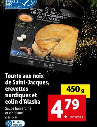 | Tourte aux noix de Saint-Jacques, crevettes nordiques et colin d'Alaska 450 g | Lidl | 3,99 € | 27 mars 2025 | 02 avril 2025 | |||