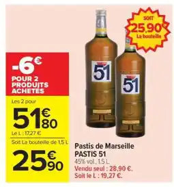 | 1 | Pastis de Marseille PASTIS 51 | Carrefour | 25,90 € | 22 janvier 2026 | 09 février 2026 | Voir l'offre | |||