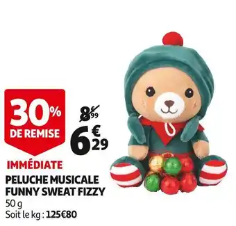 | Peluche musicale funny sweat fizzy | Auchan Supermarché | 8,99 € | 6,29 € | 2,70 € Réduction | 29 novembre 2022 | 06 décembre 2022 |
