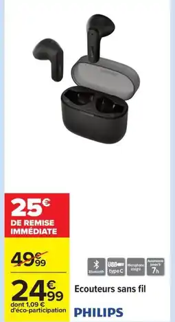 | PHILIPS Ecouteurs sans fil | Carrefour | 29,99 € | 16,99 € | 13,00 € Réduction | 17 juin 2025 | 07 juillet 2025 | |