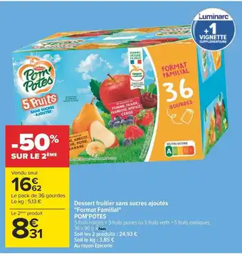 | Dessert fruitier sans sucres ajoutés "Format Familial" POM'POTES | Carrefour | 16,62 € | 8,31 € | 8,31 € Réduction | 25 juillet 2023 | 07 août 2023 | |