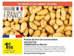 | Pomme de terre de consommation spéciale frite | Carrefour Market | 1,98 € | 21 avril 2026 | 03 mai 2026 | |||