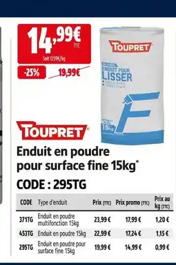 Screwfix TOUPRET Enduit de rebouchage en poudre 15kg offreTOUPRET Enduit de rebouchage en poudre 15kgScrewfix22,99 €19,54 €3,45 € Réduction25 juin 202522 juillet 2025