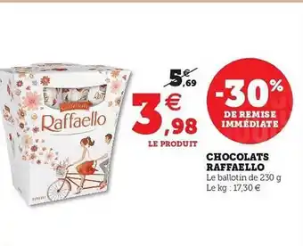 | Chocolat Raffaello | Super U | 5,69 € | 3,98 € | 1,71 € Réduction | 23 mars 2021 | 03 avril 2021 |