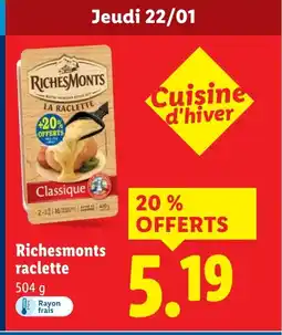 | 1 | RICHESMONTS raclette 504 g | Lidl | 5,19 € | 20% Offerts | 22 janvier 2026 | 28 janvier 2026 | Voir l'offre | ||