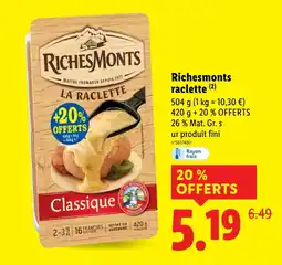 | RICHESMONTS raclette 504 g | Lidl | 5,19 € | 22 janvier 2026 | 28 janvier 2026 | |||