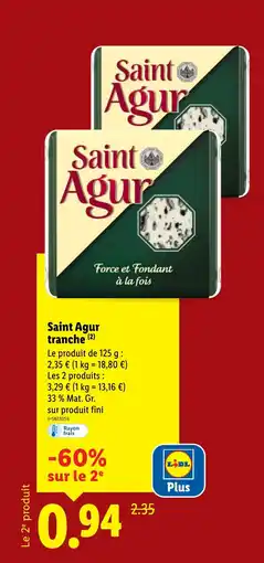 | 2 | SAINT AGUR tranche 250 g | Lidl | 2,35 € | 0,94 € | 1,41 € Réduction | 19 février 2026 | 25 février 2026 | Voir l'offre | |