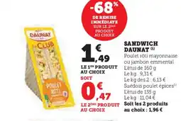 | 1 | DAUNAT Sandwich 160 g | Hyper U | 1,49 € | 0,47 € | -68% SUR LE 2ÈME | 06 janvier 2026 | 18 janvier 2026 | Voir l'offre | |