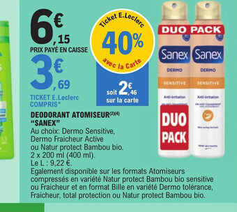 | DEODORANT ATOMISEUR(³) "SANEX" | E.Leclerc | 4,91 € | 2,95 € | 1,96 € Réduction | 10 octobre 2023 | 21 octobre 2023 | |