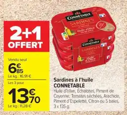| 1 | Sardines à l'huile connétable 3x135 g | Carrefour | 13,70 € | 6,85 € | 2+1 OFFERT | 06 janvier 2026 | 19 janvier 2026 | Voir l'offre | |