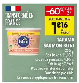 | Blini tarama saumon | Supeco | 2,89 € | 1,16 € | -60% sur le 2e | 23 décembre 2025 | 04 janvier 2026 | |