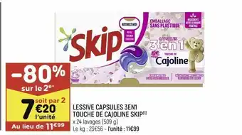 | Lessive capsules 3en1 touche de cajoline skip | Leader Price | 11,99 € | 01 août 2023 | 13 août 2023 | |||