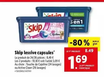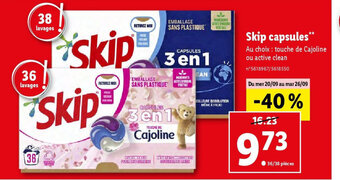 | Skip capsules** Au choix : touche de Cajoline ou active clean | Lidl | 18,23 € | 9,73 € | 8,50 € Réduction | 20 septembre 2023 | 26 septembre 2023 | |