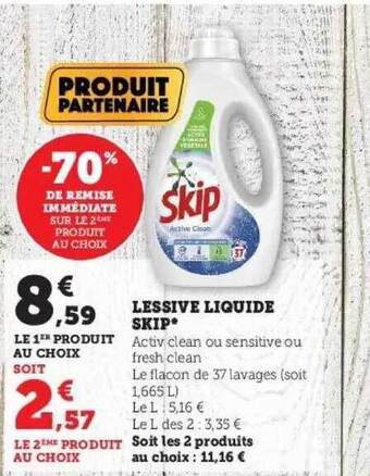 | Lessive liquide SKIP | Super U | 8,59 € | 2,57 € | 6,02 € Réduction | 04 octobre 2022 | 15 octobre 2022 | |