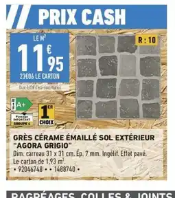 | Grès cérame émaillé sol extérieur agora grigio agora grigio | Brico Cash | 11,95 € | 10 juillet 2026 | 15 août 2026 | |||