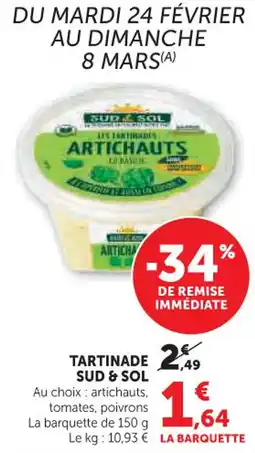 | Tartinade sud & sol 150 g | Hyper U | 2,49 € | 1,64 € | -34% DE REMISE | 24 février 2026 | 08 mars 2026 | |