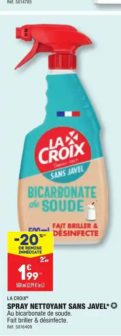 | LA CROIX® SPRAY NETTOYANT SANS JAVEL | ALDI | 2,49 € | 1,99 € | 0,50 € Réduction | 30 janvier 2024 | 05 février 2024 | |