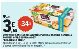 E.Leclerc Express CHARLES ET ALICE Compotes sans sucres ajoutés pommes bananes vanille & pommes offre gourmande offre